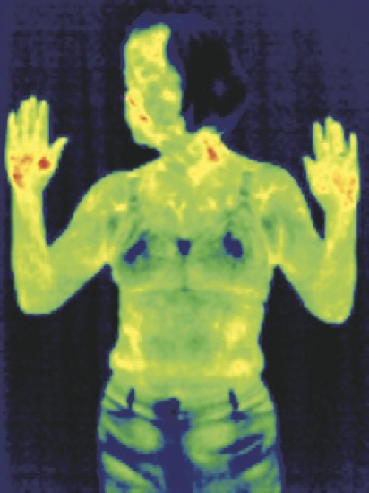 サーモグラフィーのように、着用していない部分も含めて体温の低い部分の温度が上昇し、赤いエリアが広がるイメージです。