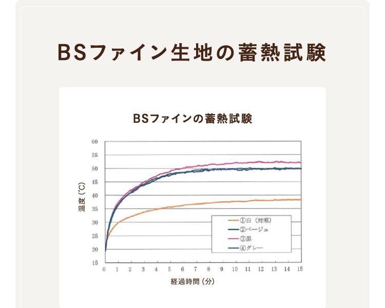 一般の温か素材は生地が発熱して身体を温めますが、BSファインは繊維中の鉱石の遠赤外線で身体を温め、その体温を生地が蓄熱することで、衣服内の空気層を一定に保ちます。