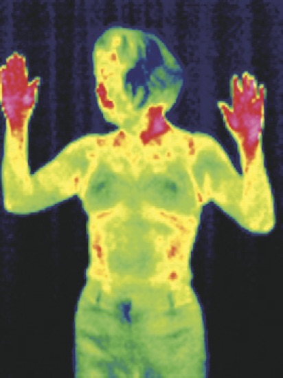 サーモグラフィーのように、着用していない部分も含めて体温の低い部分の温度が上昇し、赤いエリアが広がるイメージです。